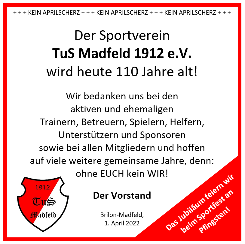 Heute, am 01.04.2022, wird unser Sportverein 110 Jahre alt, denn am 01.04.1912 entstand die erste Satzung des TuS Madfeld 1912 e.V.!